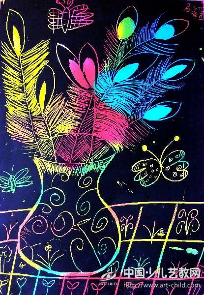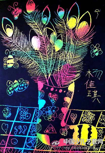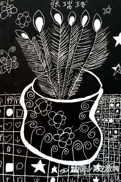 刮画——翎羽花瓶